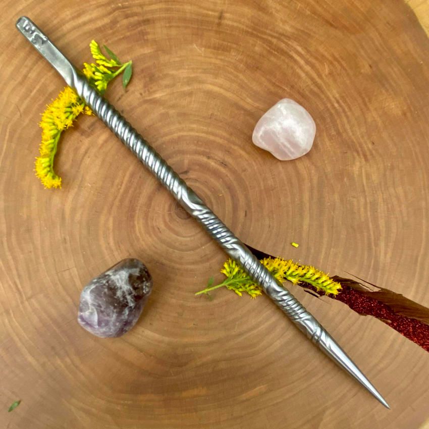 Each of Paul's iron wands are unique. There is no plan beforehand, the ritual tool is allowed to manifest as it wills, Paul just helps it along. The twists back and forth talk to the dual nature of magick, as does the contrast between the light shiny detailed areas of the wand and the darker inner areas.