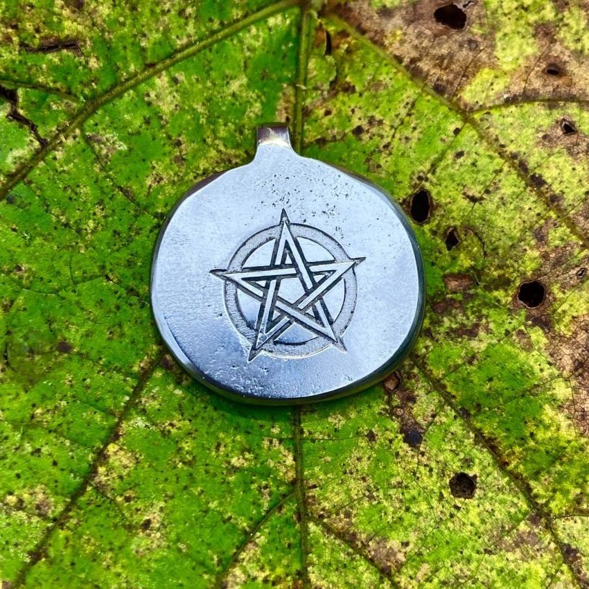 Paul’s hand forged witchcraft pendants are very popular! They are stamped with a pagan symbol onto a blank cut by Paul by hand. They are then rounded on a grinder and beveled. Then burnished with a fine wire rotary wire brush and then lightly polished.