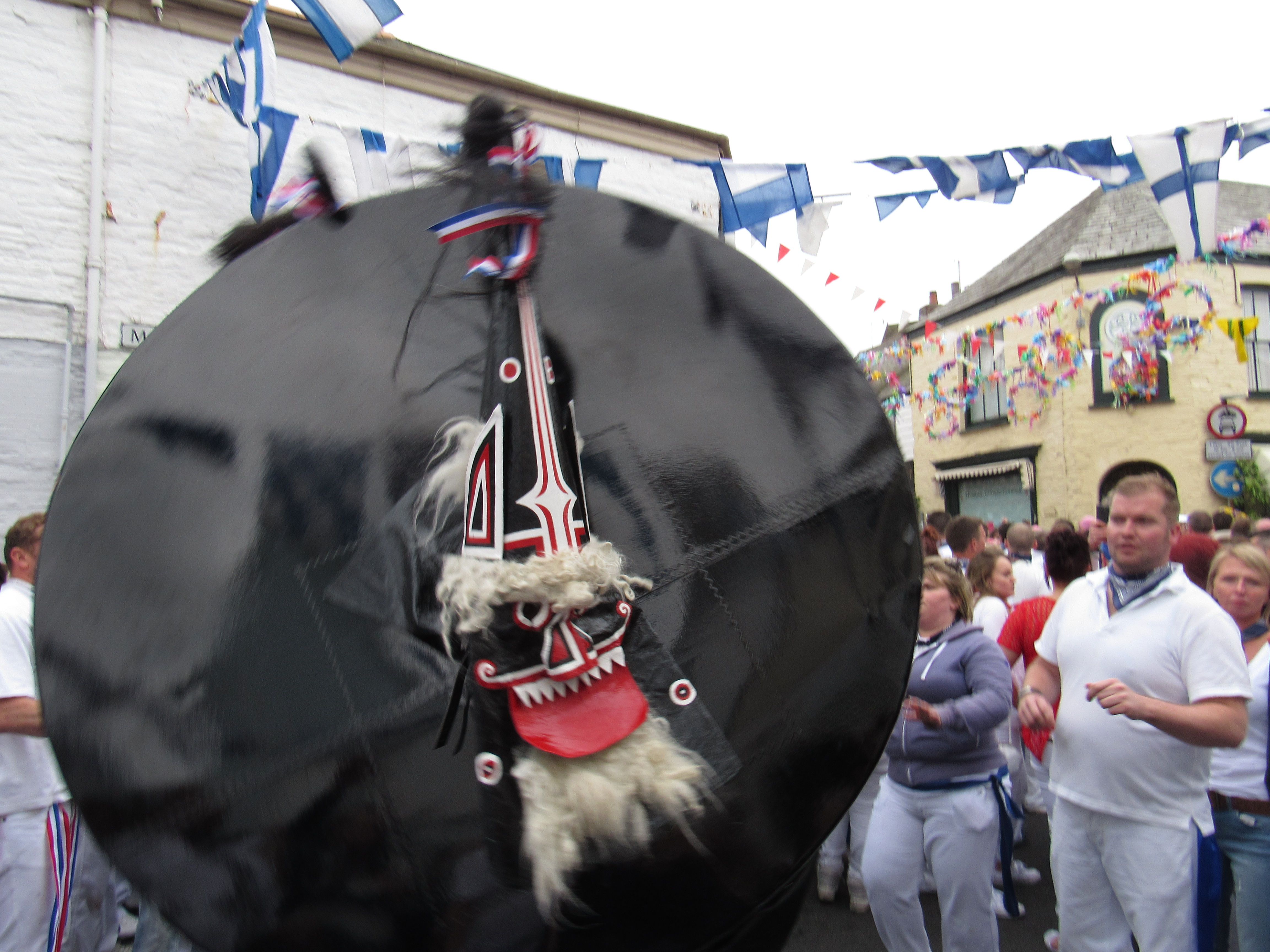 Celebrated on May Day (May 1st), the festival is of course born of Beltane, the Gaelic pagan fire festival marking the fertile half of the year from spring onwards. Historically, Beltane was a time of fire, fertility, sex, passion and the thinning of the veil between worlds. In Padstow, these themes are funneled into a joyous drunken pagan 12-hour procession of two "osses"—the Old 'Oss and the Blue Ribbon 'Oss. These are not mere costumes; they are towering, black-canvased figures with stylized shamanic pagan masks, danced through the streets to the pagan beat of drums!